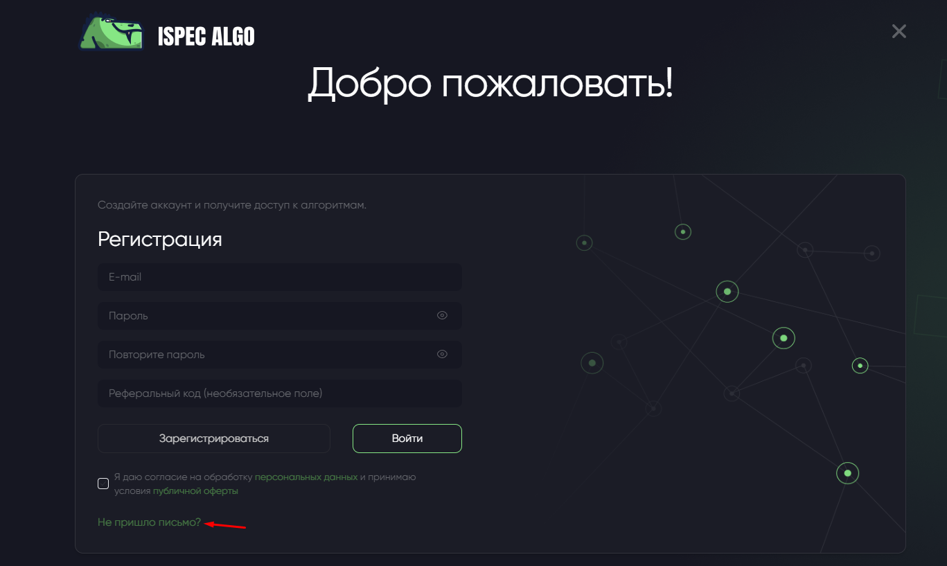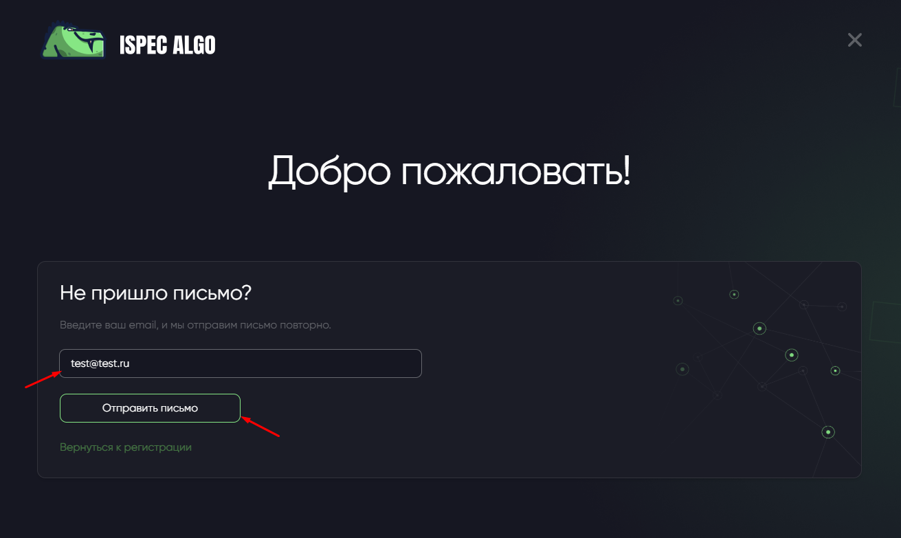 **Если письмо не приходит**, попробуйте отправить его повторно, для этого нажмите **Не пришло письмо ?** в поле Email укажите почту по которой вы регистрировались и нажмите на кнопку **Отправить письмо**